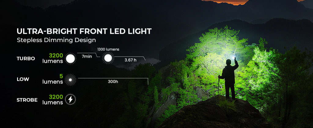 • Faisceau intense: LED 6500K. La lumière latérale s’ajuste entre 4500K chaud et 6000K froid. Portée max. : 845 m.